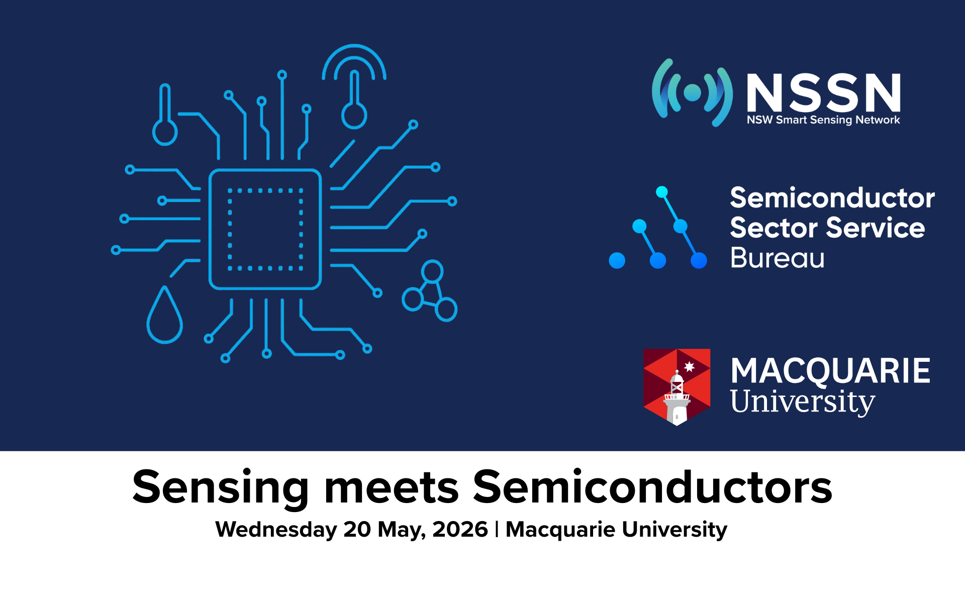 Sensing meets Semiconductors is a joint event hosted by the NSW Smart Sensing Network (NSSN) and the Semiconductor Sector Service Bureau (S3B), bringing together researchers, industry and government working at the intersection of sensing and semiconductor innovation.